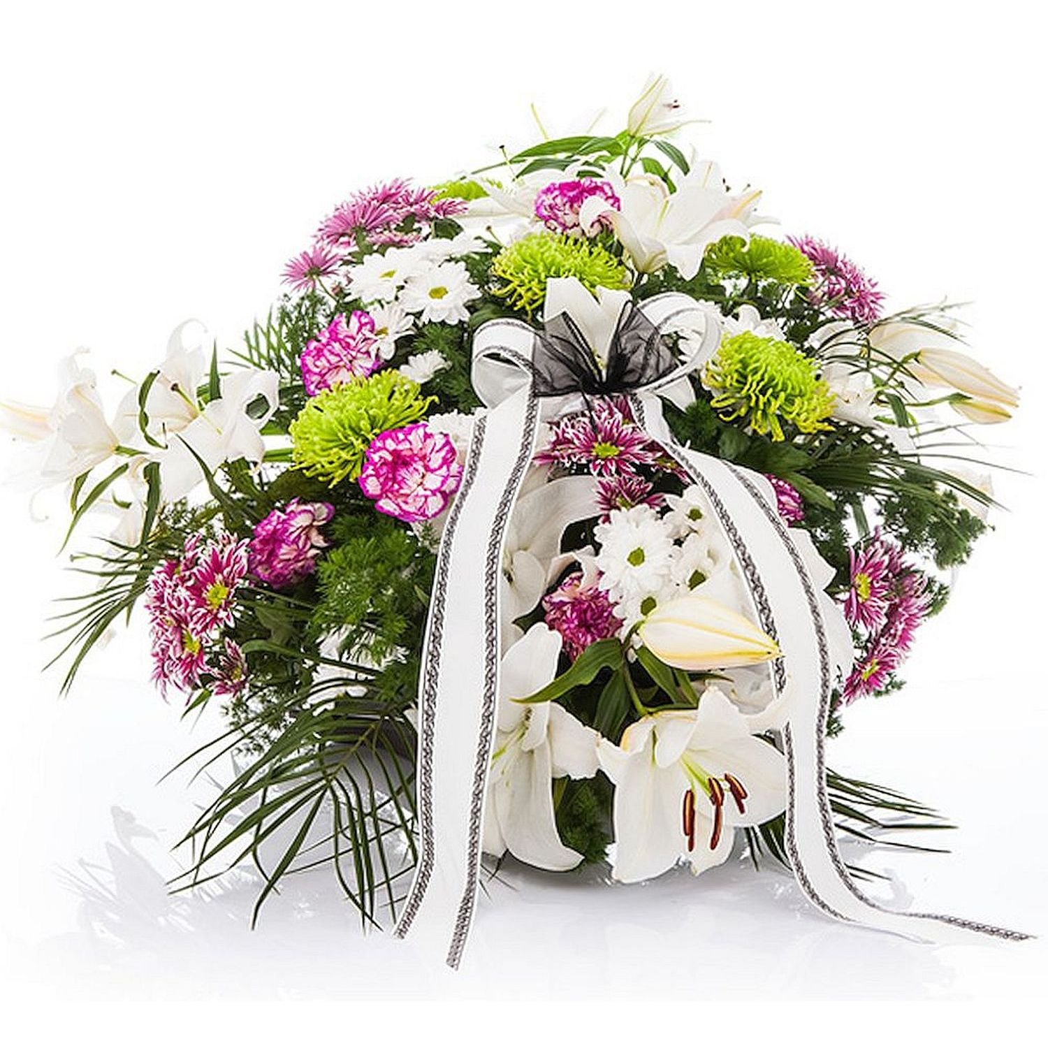 | Large | Chrysanthemums, Stargazer Lilies, Single Bloom Chrysanthemums, Carnations, Oasis floral Foam & Decorative greenery (20 stems) |