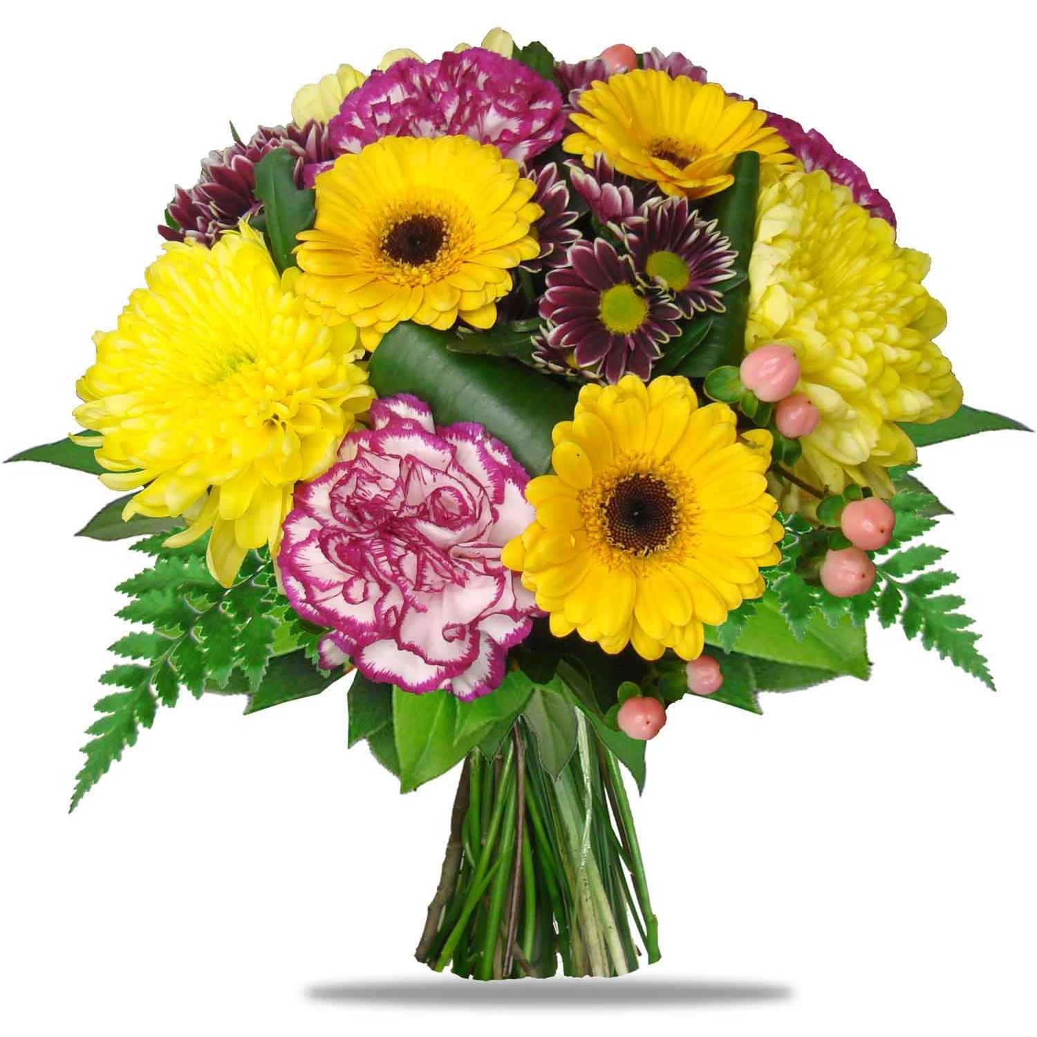 Standard Single Bloom Chrysanthemums, Mini Gerberas, Carnations, Santini Chrysanthemums, Hypericum & Decorative greenery (11 stems)