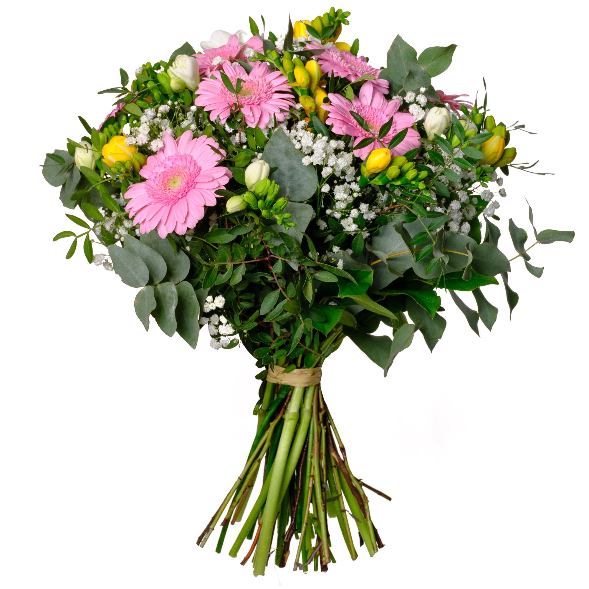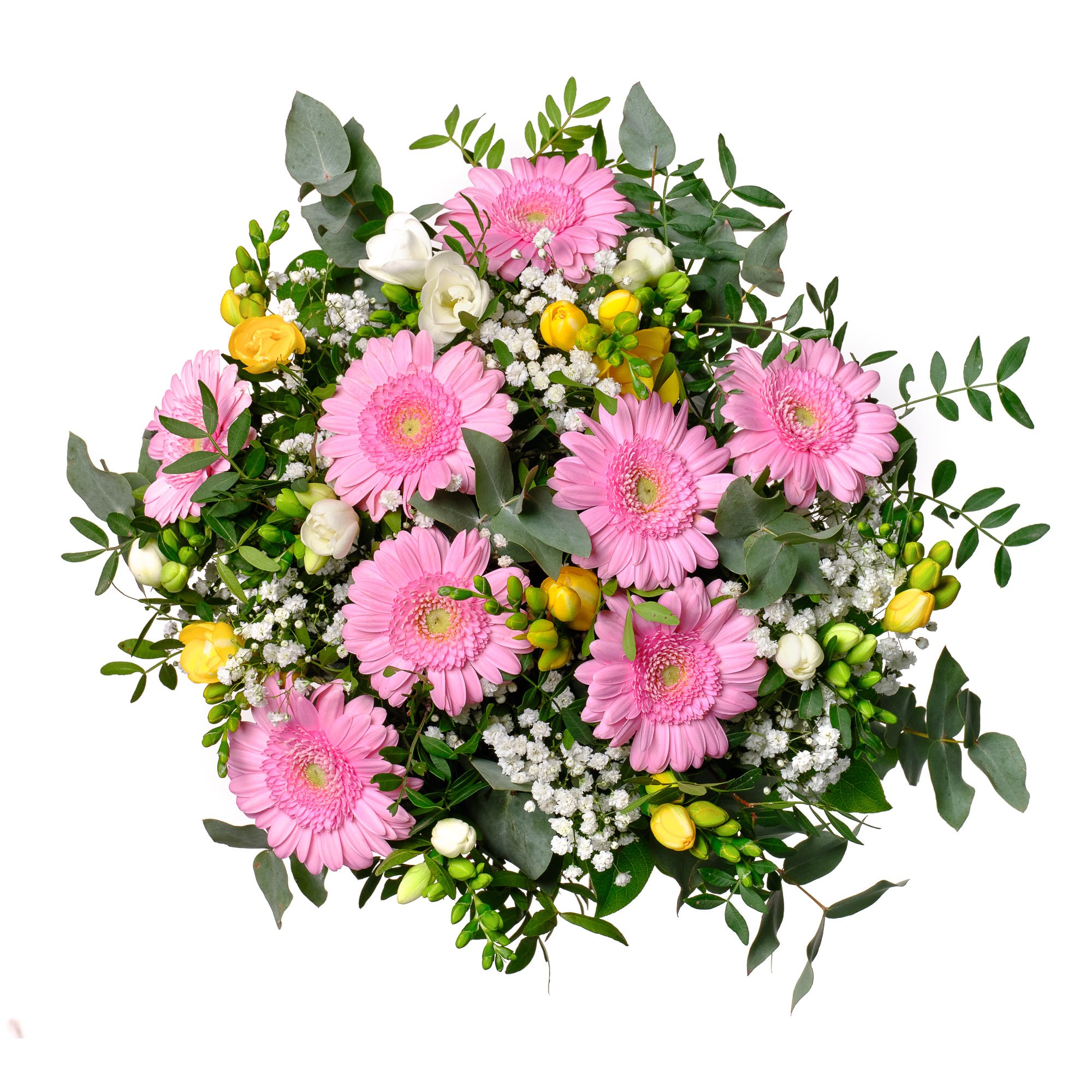 Mini Gerberas, Freesias, Gypsophila & Decorative greenery (23 stems)