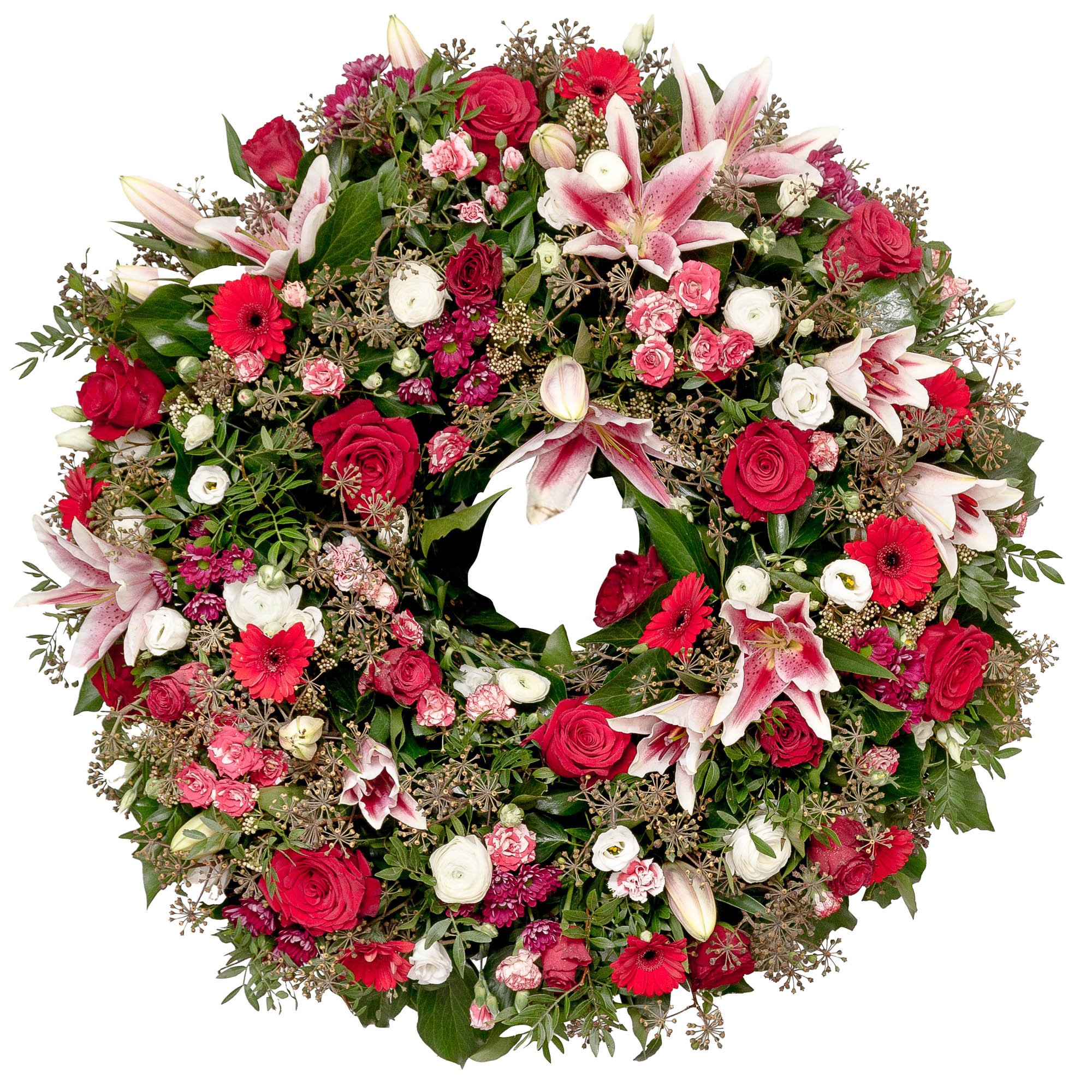 Standard Stargazer Lilies, Mini Gerberas, Roses, Bush Carnations, Chrysanthemums, Lisianthus, Limonium, Wreath Ø50cm & Decorative greenery (44 stems)