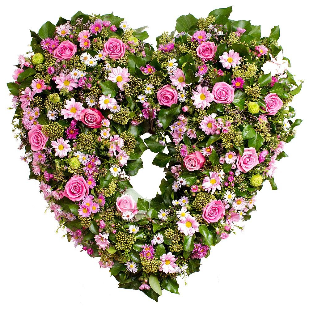 Roses, Carnations, Asters, Mums, White Stock, Gypsophila (Baby's Breath), Open heart standing spray. Approximate size 70cm (34") with a minimum of 60 stems.