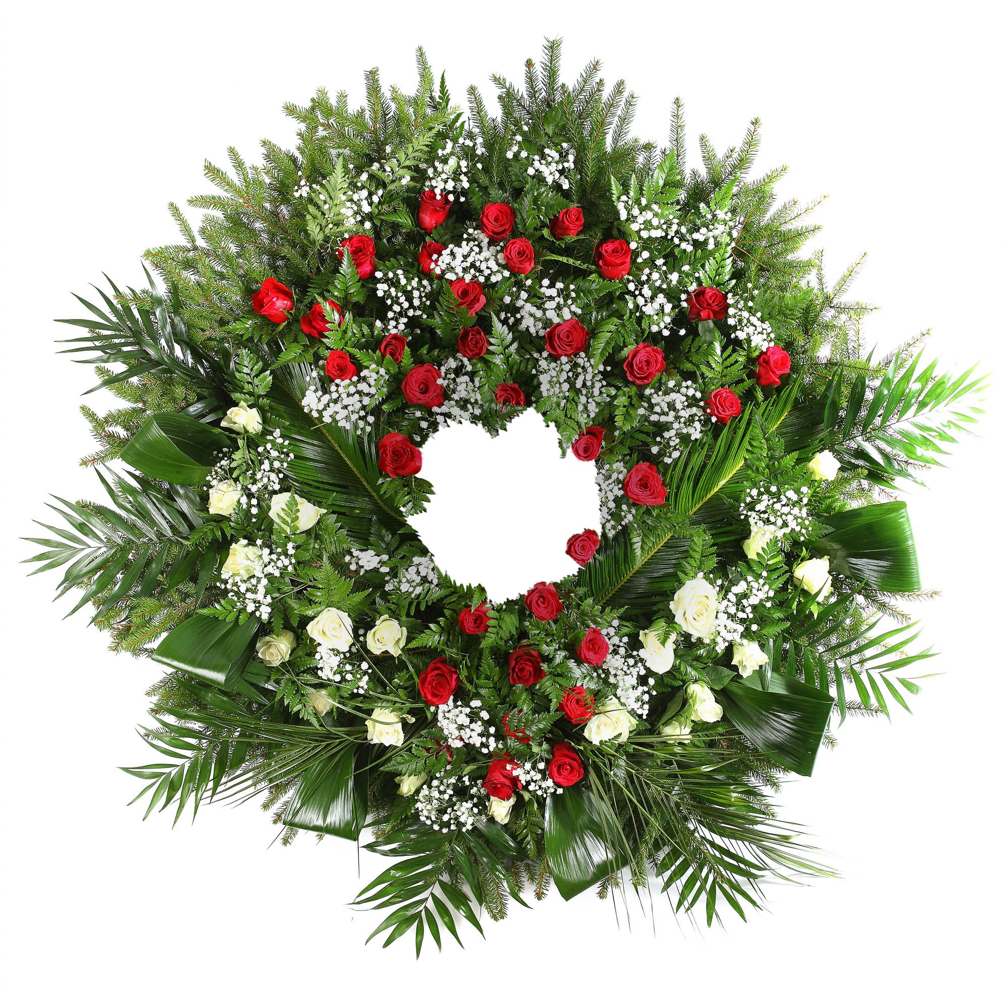 Standard Roses, Gypsophila, Sympathy Ribbon, Wreath Ø50cm & Decorative greenery (41 stems)