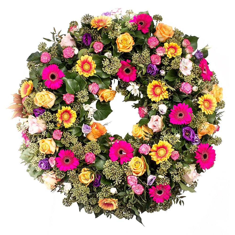 | Ø 60cm | Wreath approximately Ø 60cm. Roses, Mini Gerberas, Lisianthus, Alstroemerias, Gypsophila, Wreath Ø80cm, Sympathy Ribbon & Decorative greenery |