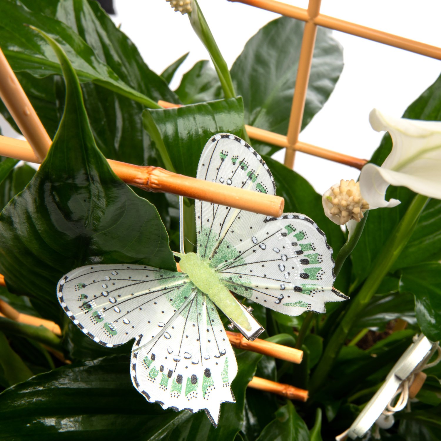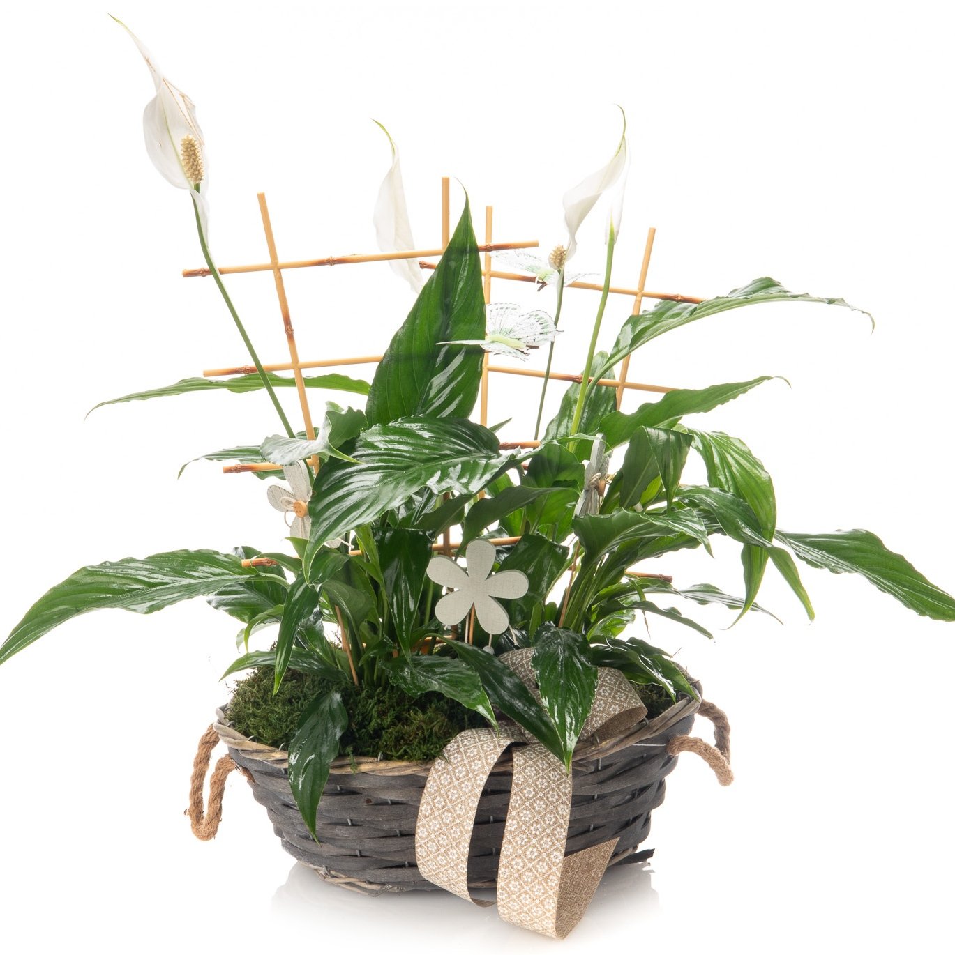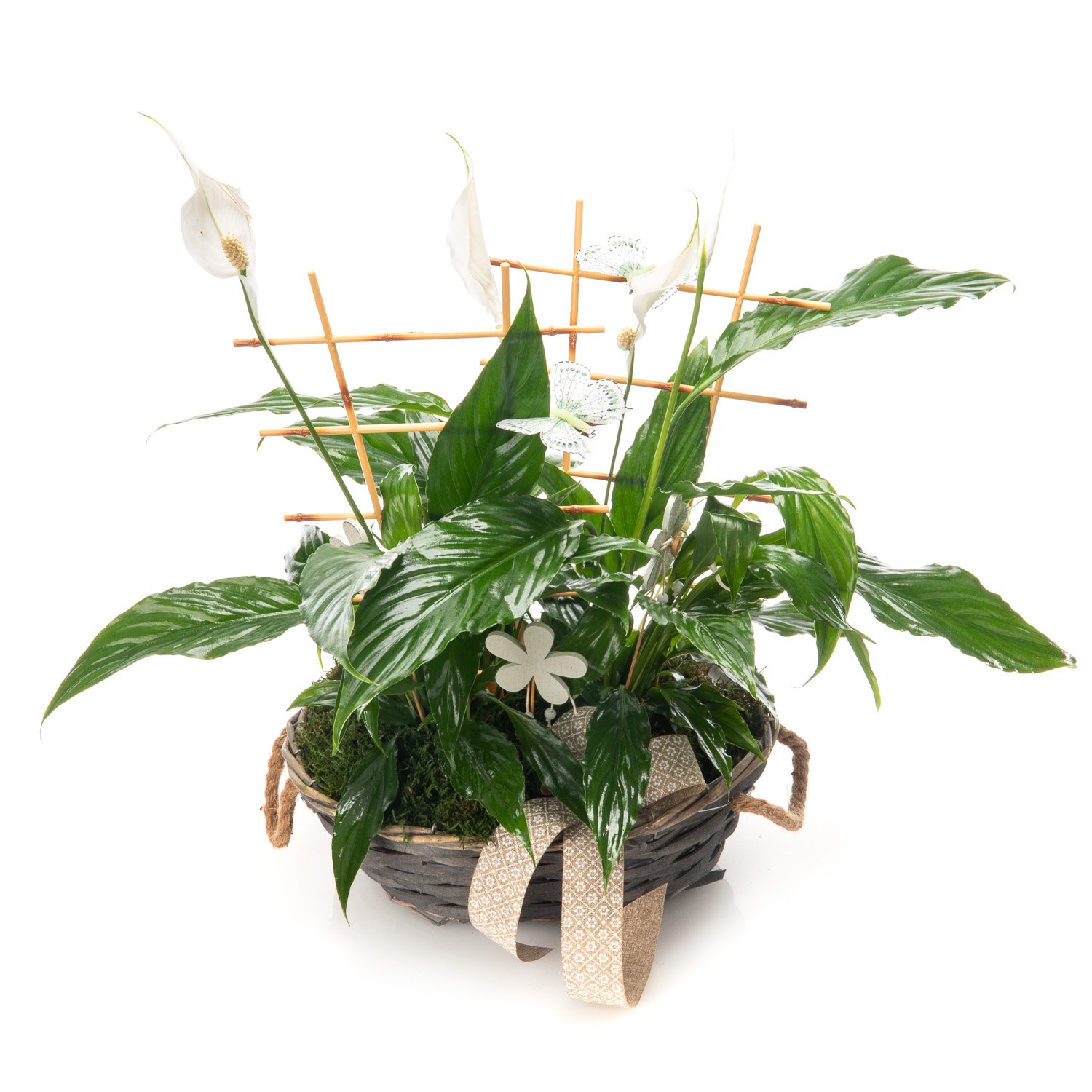 Potted Peace Lily, seasonal decorations, Decorative bow, Basket & Decorative greenery