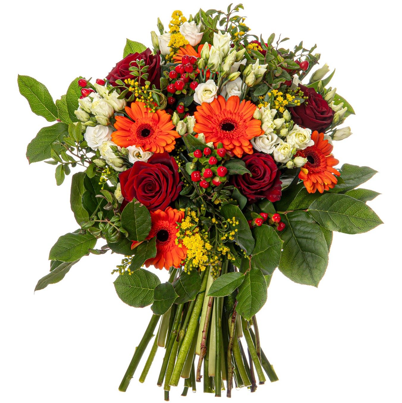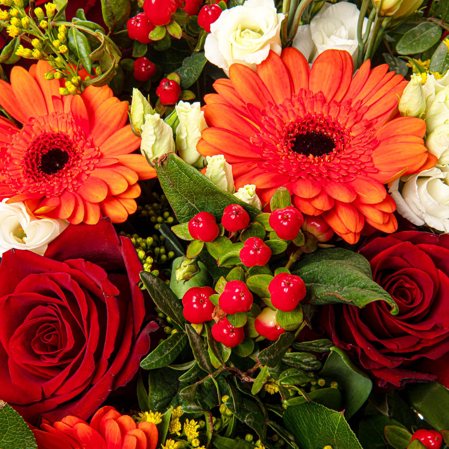 | Exclusive | Roses, Mini Gerberas, Hypericum, Lisianthus, Goldenrods & Decorative greenery (27 stems) |