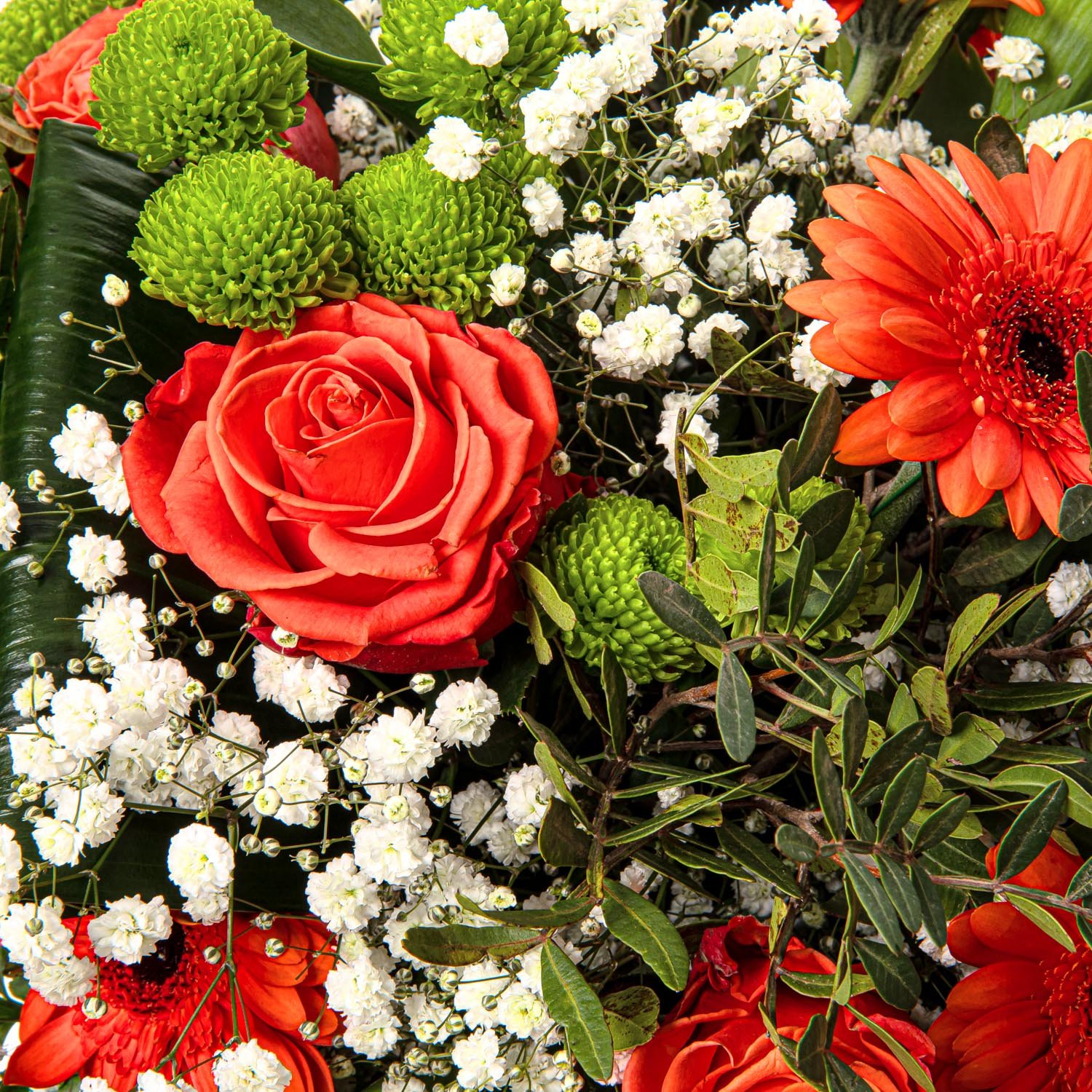 Large Roses, Mini Gerberas, Santini Chrysanthemums, Gypsophila & Decorative greenery (19 stems)