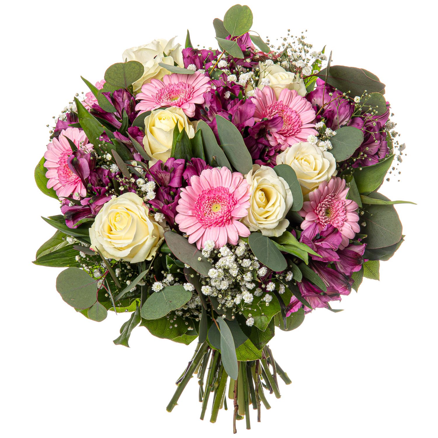 | Large | Roses, Mini Gerberas, Alstroemerias, Gypsophila, Eucalyptus & Decorative greenery (20 stems) |
