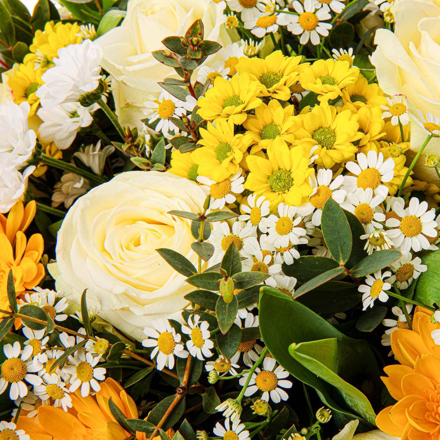 Mini Gerberas, Roses, Chrysanthemums, Camomile & Decorative greenery (21 stems)