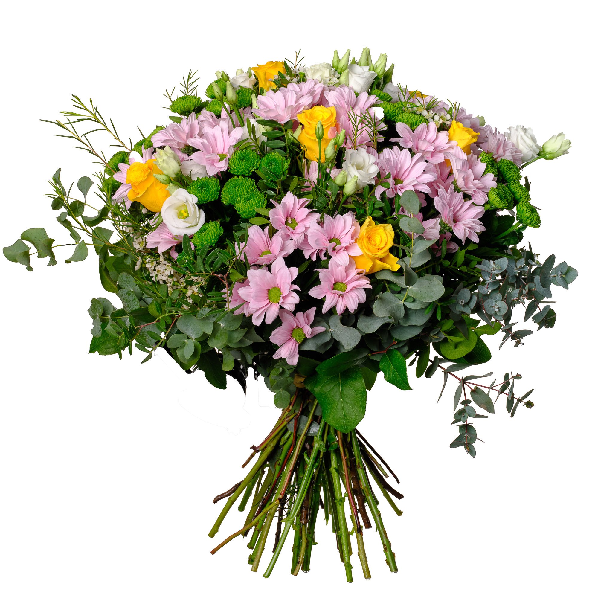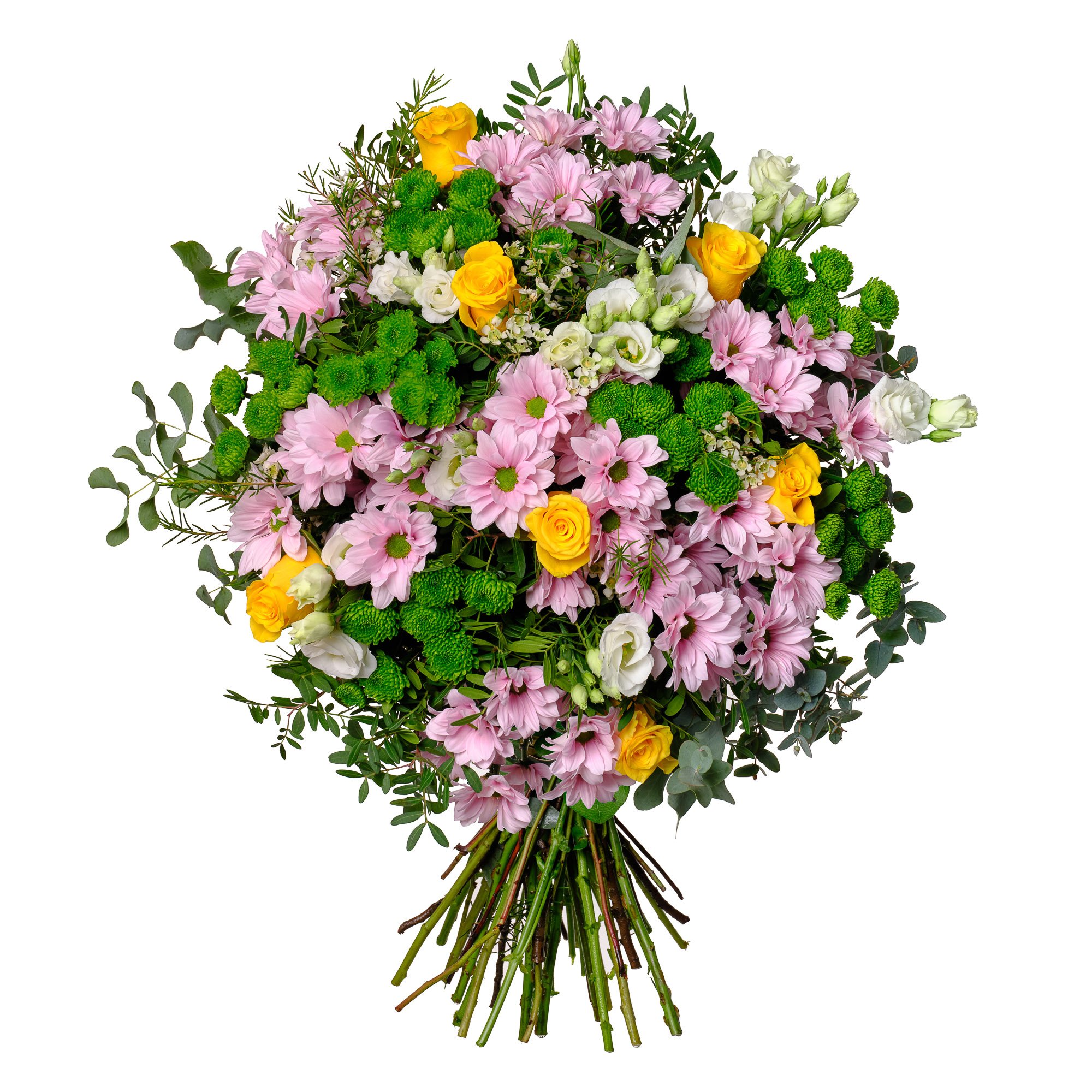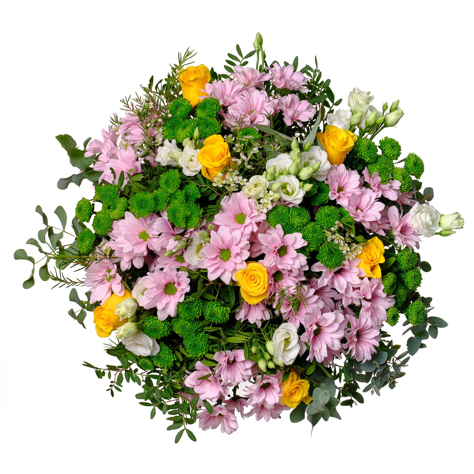 Exclusive Roses, Santini Chrysanthemums, Pink Chrysanthemums, Lisianthus, Waxflower & Decorative greenery (28 stems)