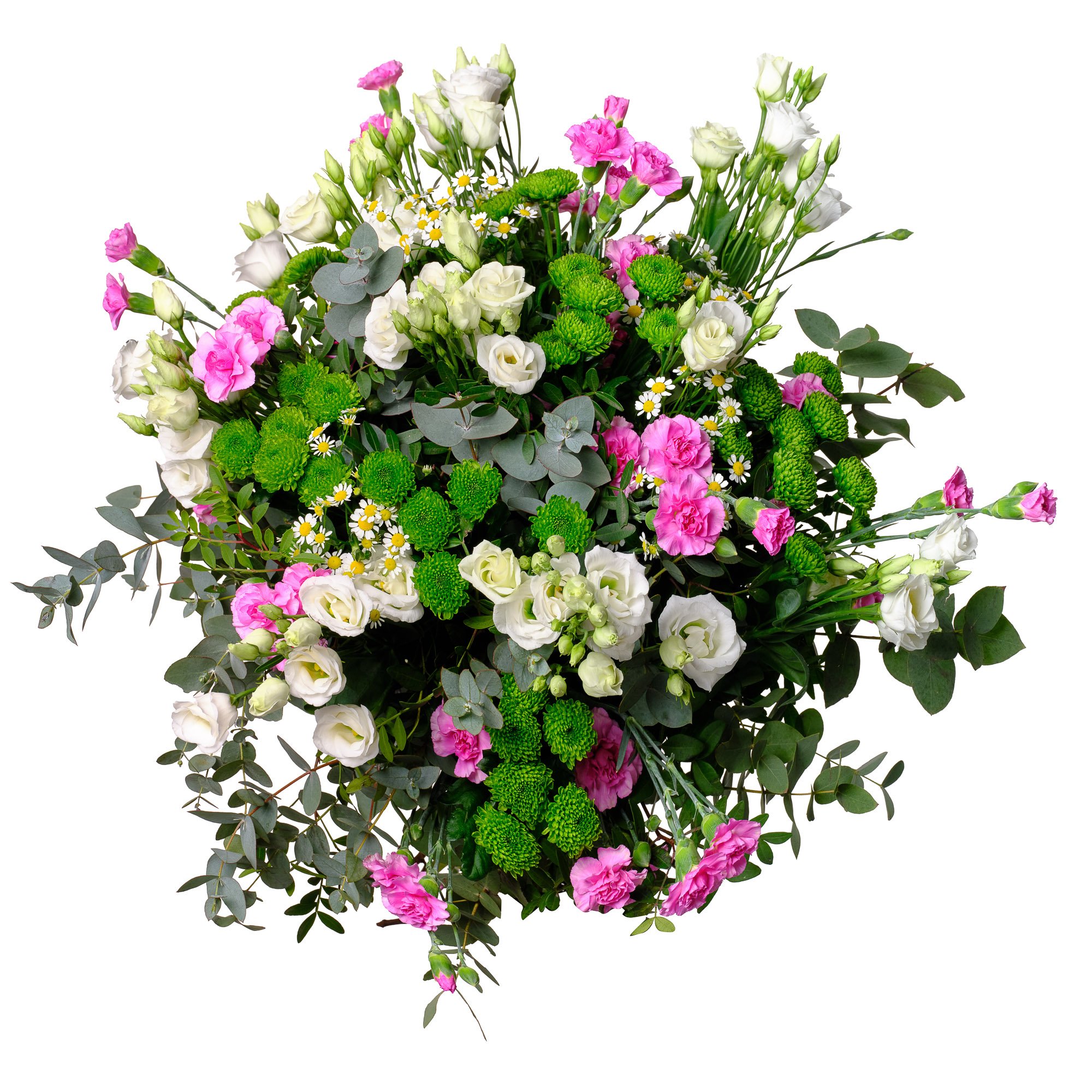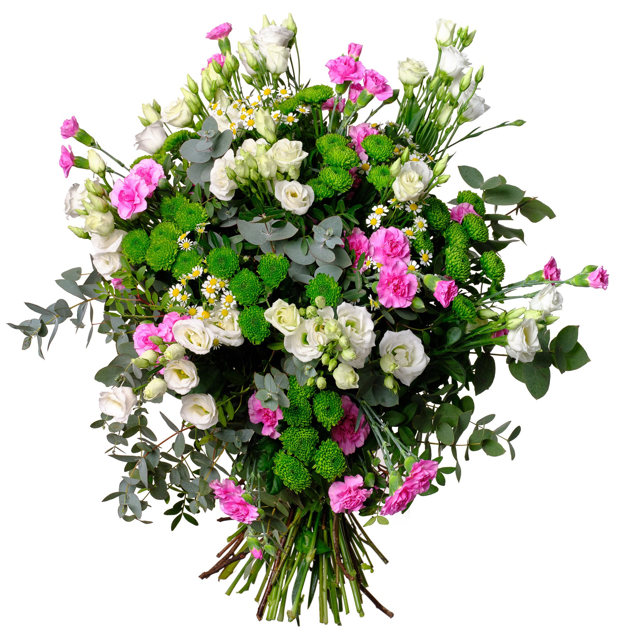 Large White Lisianthus, Pink bush Carnations, Chrysanthemums, Chamomile and Decorative greenery (19 stems)