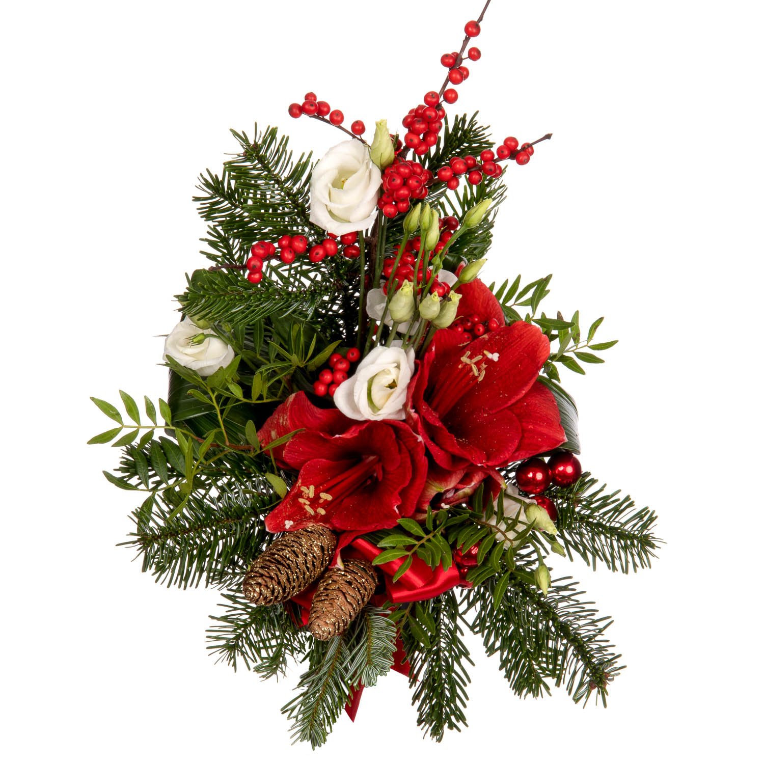 1 ks amarylis, 1 ks ilex, 2 ks eustoma, mašle, vánoční dekorace a dekorativní zeleň