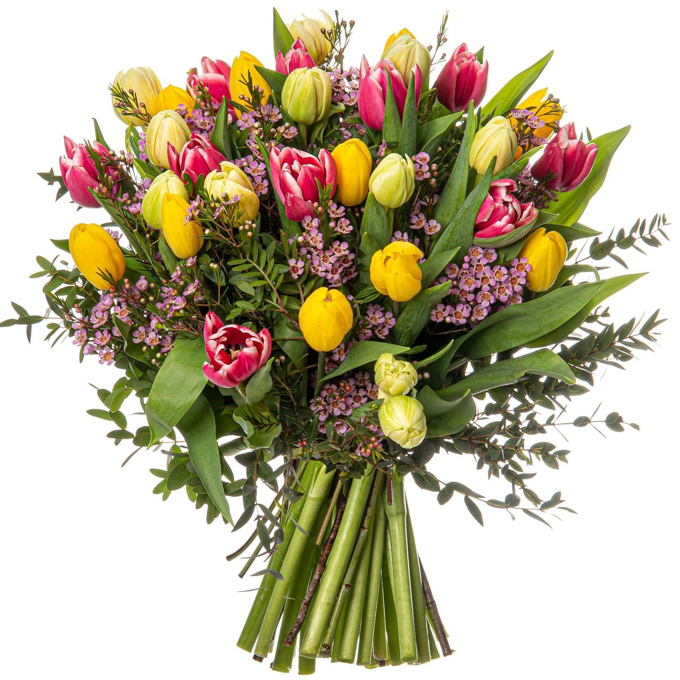 | Standardní | 5 ks tulipán růžový, 5 ks tulipán bílý, 5 ks tulipán žluty, 4 ks růžový/fialový wax, pistacie, eucalyptus a dekorativní zeleň |