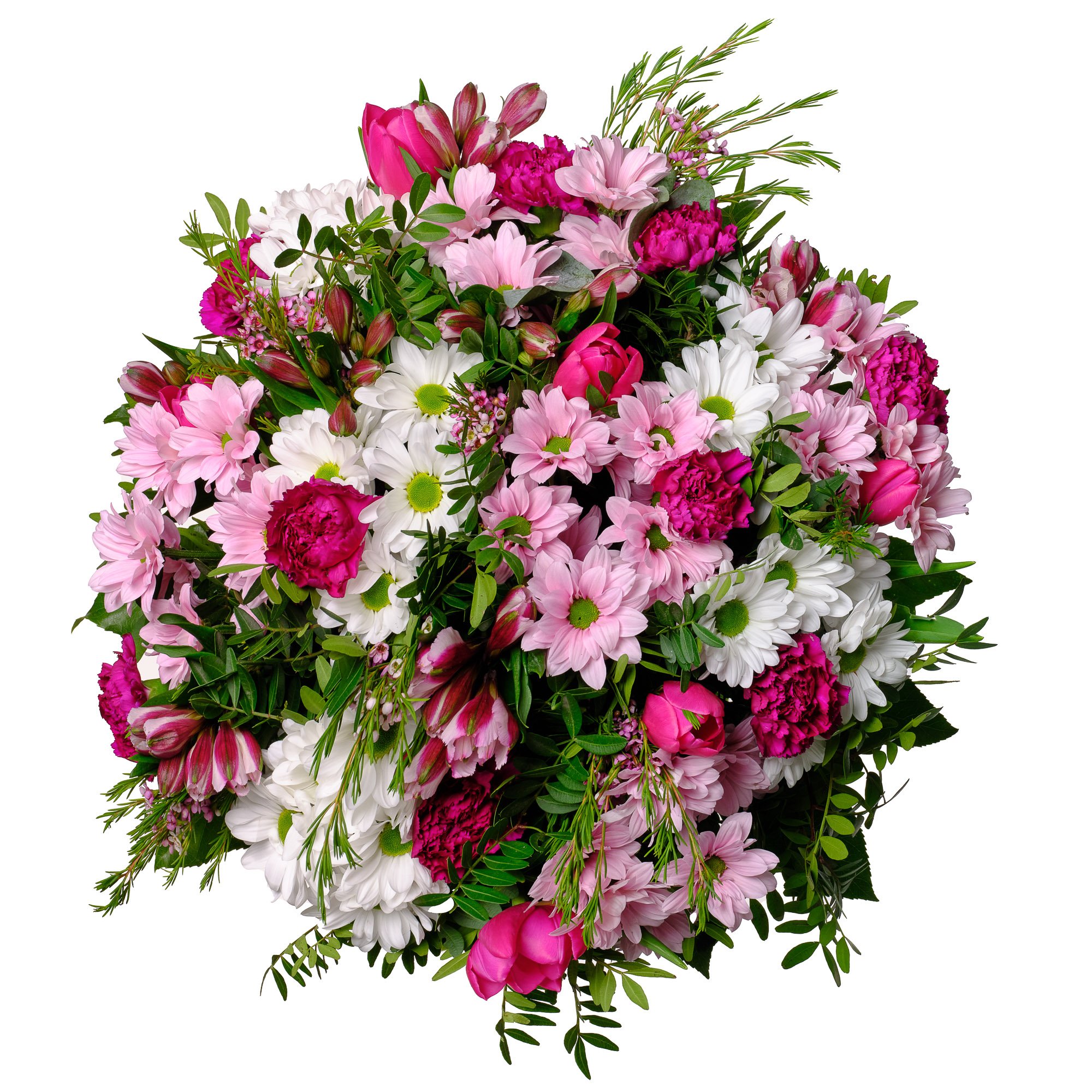 | Velká | 4 ks bílá chryzantéma, 4 ks růžová chryzantéma, 5 ks alstromerie, 7 ks karafiáty, 3 ks wax, 5 ks tulipán a dekorativní zeleň (pistaci, eukalyptus, aralie) |
